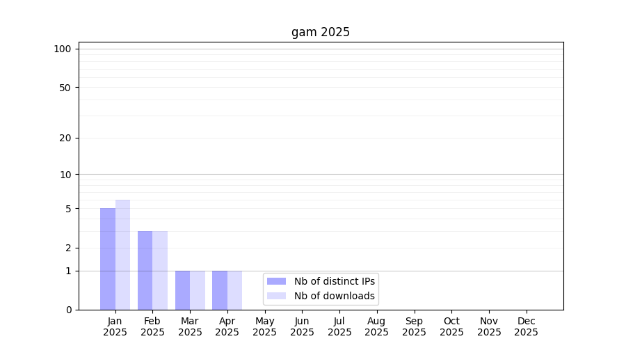 Number of downloads for workflow package gam, year by year, from 2025 back to 2015 (years with no downloads are omitted):